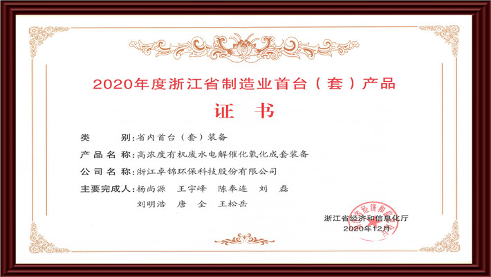 卓錦股份自主研發(fā)的“高濃度有機(jī)廢水電解催化氧化成套裝備”成功入選2020年度浙江省裝備制造業(yè)重點(diǎn)領(lǐng)域首臺(tái)(套)產(chǎn)品。
